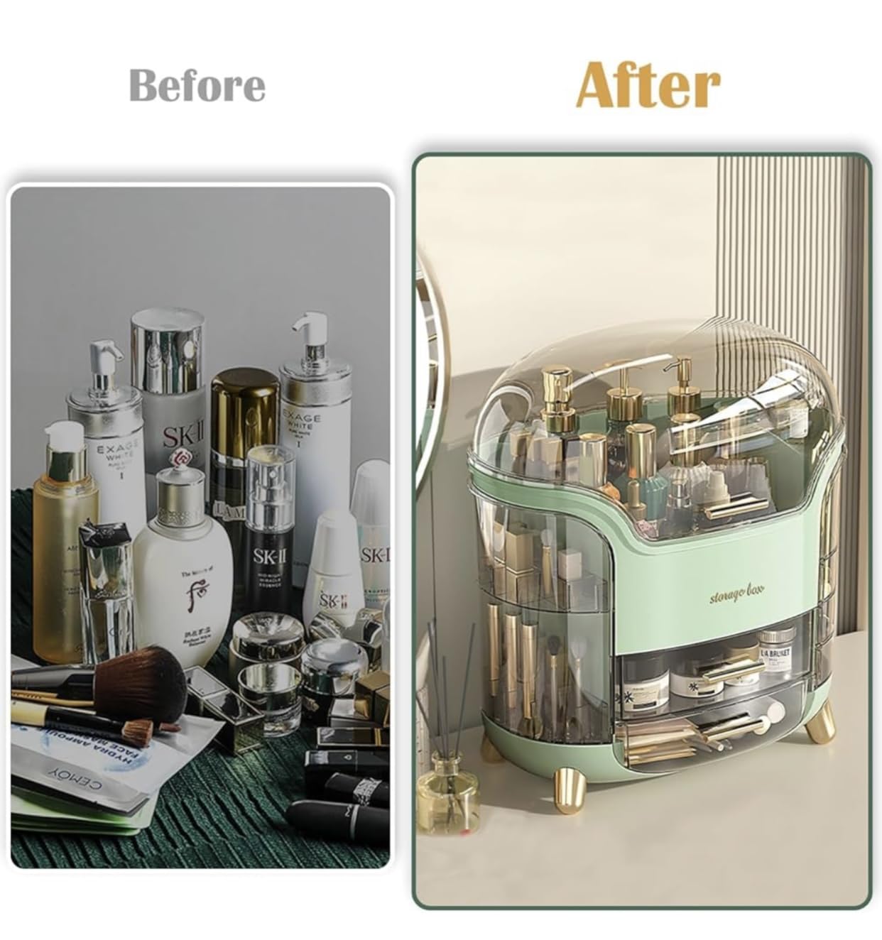 - Versatile Storage: This makeup organizer box provides ample space to neatly store and organize your cosmetics, skincare, and bathroom essentials on your countertop or in drawers.