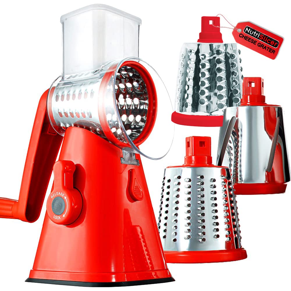 - Dishwasher-safe; Included are the NutriSlicer User Guide, and 3 stainless-steel drums that remain sharp indefinitely.