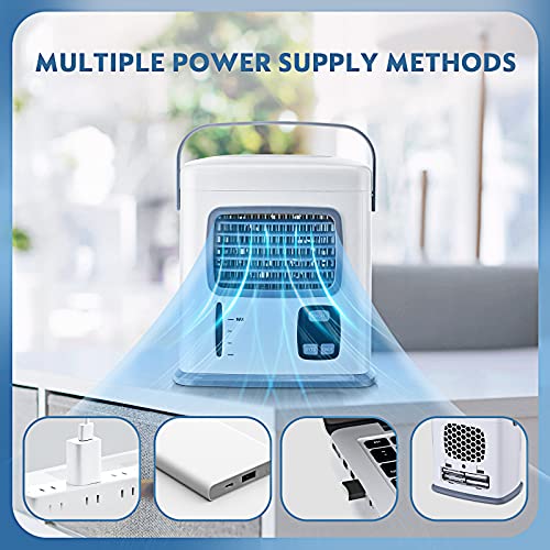 - 【Portable & Compact Air Cooler for Small Room】It is too hot outside without an air conditioner? You can easily lift the 1.5lbs portable water cooling fan w/ a portable handle. Take it anywhere to fast cool down and no longer restricted by wire w/ 2 ways of power supply. The air cooler can be powered by 4 AA batteries or USB charging. Not only that, the fan can be plugged into the power bank, laptop, or car cable. Ideal for offices, homes, bedrooms. Air Conditioner to Carry Anywhere!